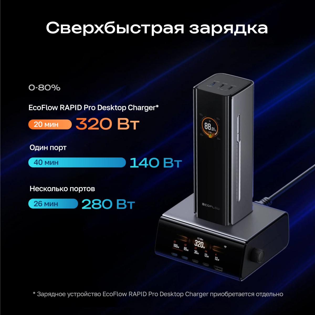 • Быстрая зарядка всего 20 минут до 80% с зарядной станцией EcoFlow RAPID Pro 320 Вт