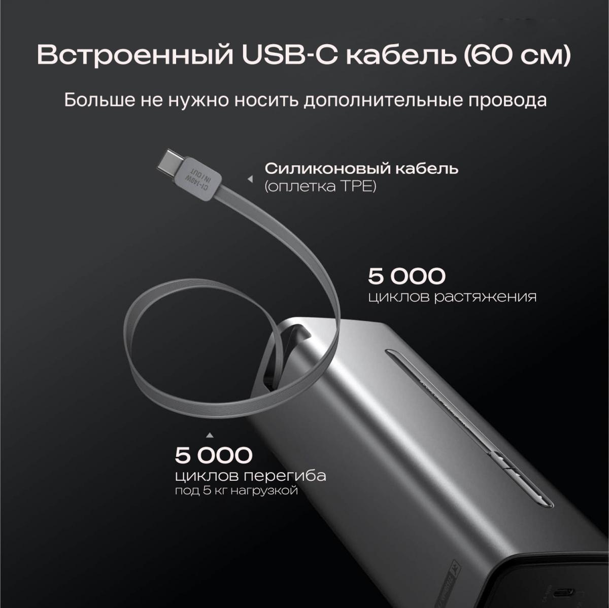 Встроенный кабель: Type-C (двусторонняя быстрая зарядка 140 Вт), длина - 60 см