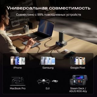 • Зарядка нескольких устройств (300 Вт) общая мощность 300 Вт, встроенный выдвижной кабель USB-C 140 Вт, порт USB-C 140 Вт, 2 порта USB-C по 65 Вт каждый