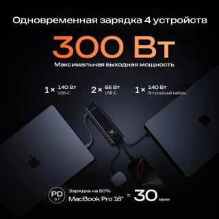 Порты: 3 порта USB-C + встроенный кабель (суммарно 300 Вт)